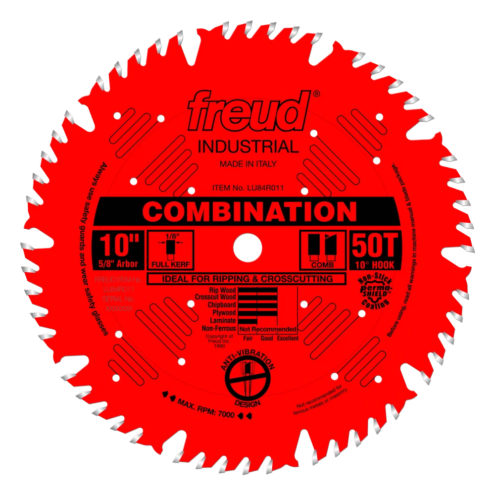 50 combination (ATB & Flat Top) tooth, 10° hook, 0.126″ kerf, 5/8″ arbor.