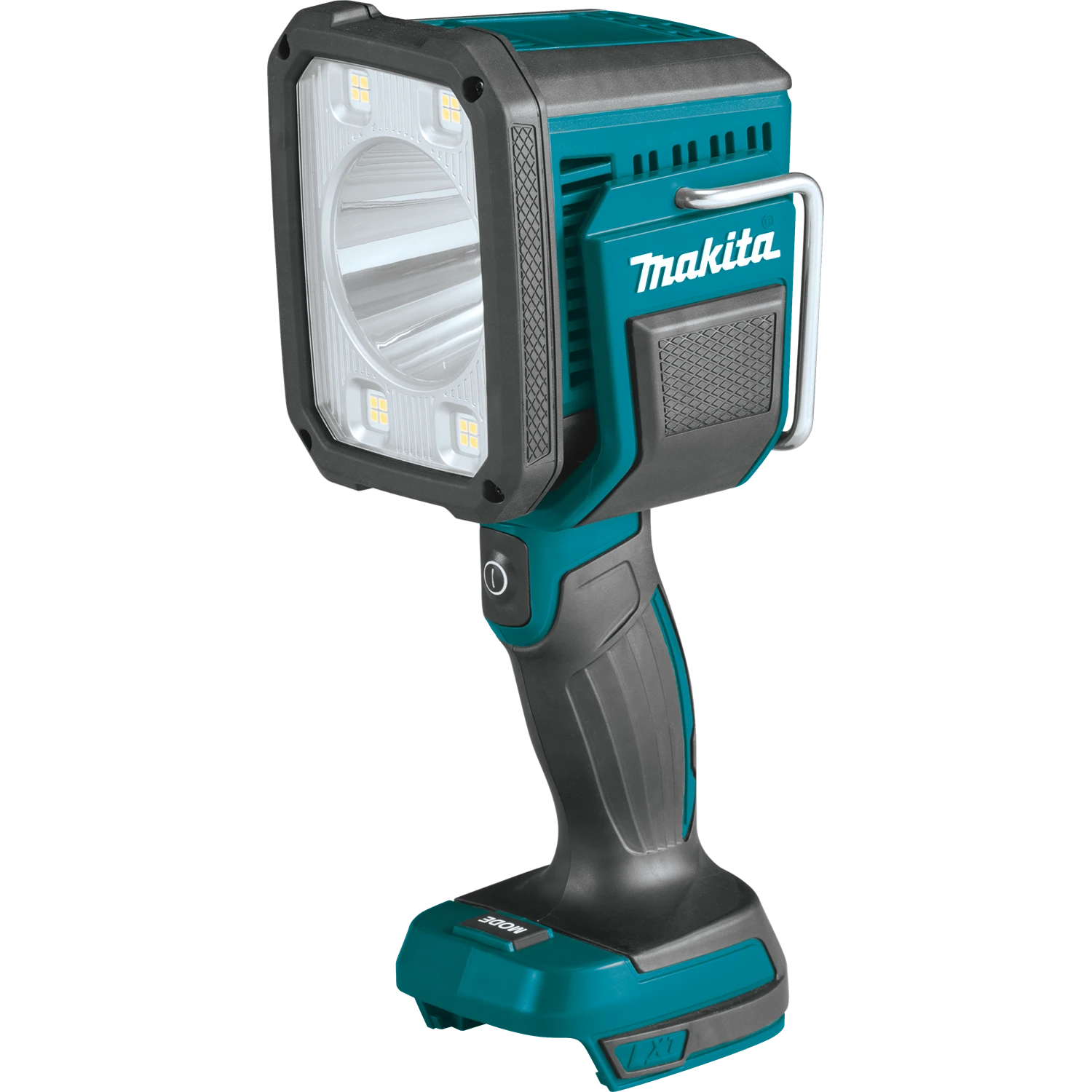 The Makita 18V LXT L.E.D. Flashlight/Spotlight (DML812) delivers bright illumination, versatility, and convenience. The flashlight has 4 modes of operation: Spotlight, delivering 600 lumens, Floodlight, delivering 1,000 lumens, Spot/Flood delivering 1,250 lumens, and Strobe.