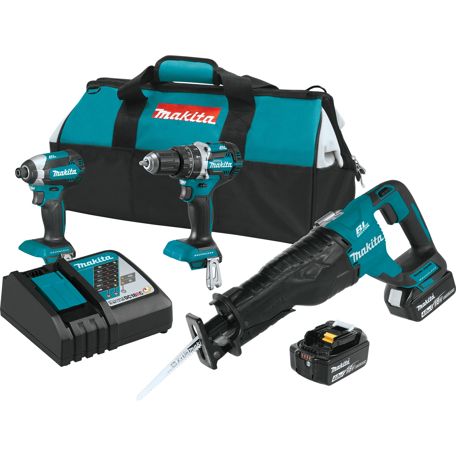The Makita 18V LXT Lithium-Ion Brushless 3-Piece Combo Kit (model XT328M) gives you three efficient brushless tools for drilling, driving, fastening, and demolition. You also get the category’s fastest-charging 4.0 Ah batteries and the expansive breadth-of-line of the Makita 18V LXT battery platform, so your batteries will power the expanding range of Makita tools and accessories. The XT328M includes a variable speed 1/2″ hammer driver-drill with two speed settings, and a variable speed impact driver with a full 1,500 inch-pounds of Max Torque. The recipro saw has a refined crank mechanism design that minimizes blade deflection and reduces vibration for faster, more efficient cutting. For added convenience, the 18V LXT 4.0Ah battery has an on-board L.E.D. charge-level indicator and reaches a full charge in only 40 minutes.